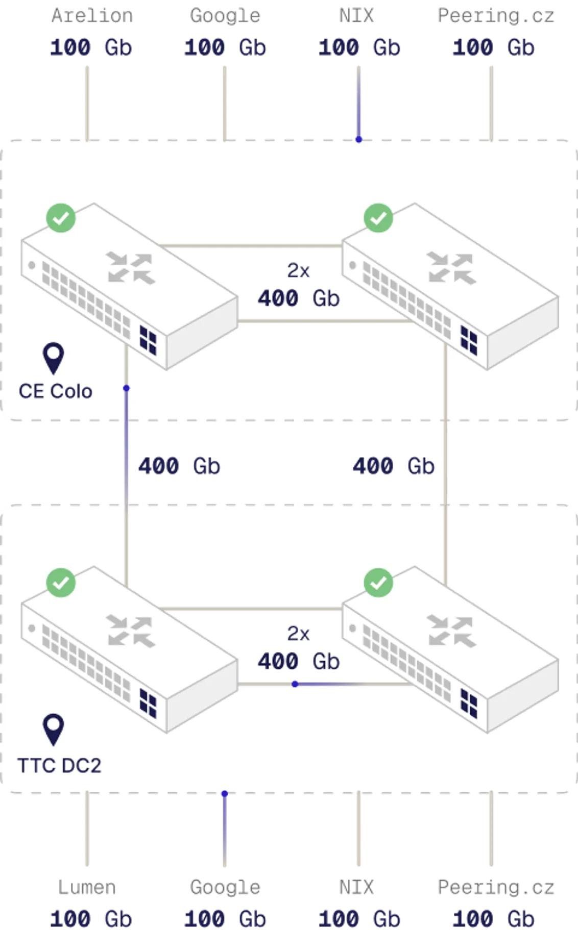 Máme vlastní optickou síť o délce více než 500 km a páteřní spoje s vysokou propustností až 400 Gb/s. Díky tomu dokážeme do internetu poslat až 600 Gb/s a zprostředkovat konektivitu i těm nejnáročnějším projektům jako jsou třeba platformy pro streamování videa ve vysokém rozlišení.